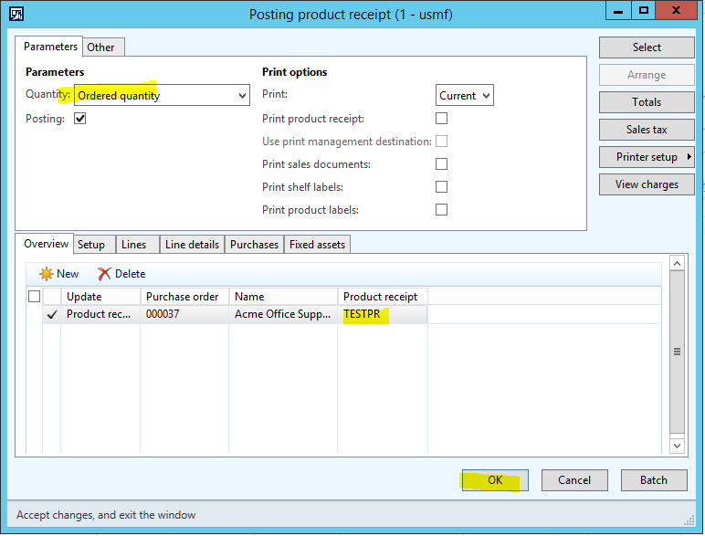 - In the Posting product receipt form, select ‘Ordered quantity’ from the Quantity drop-down field, enter ‘TESTPR’ in the Product receipt field, and then click OK.