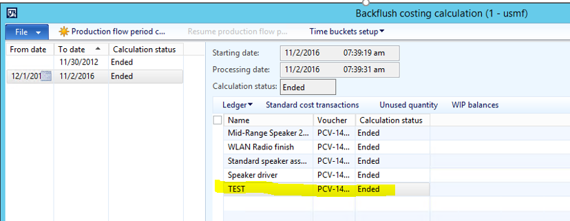 - In the Backflush costing calculation form, click on the TEST Production flow.