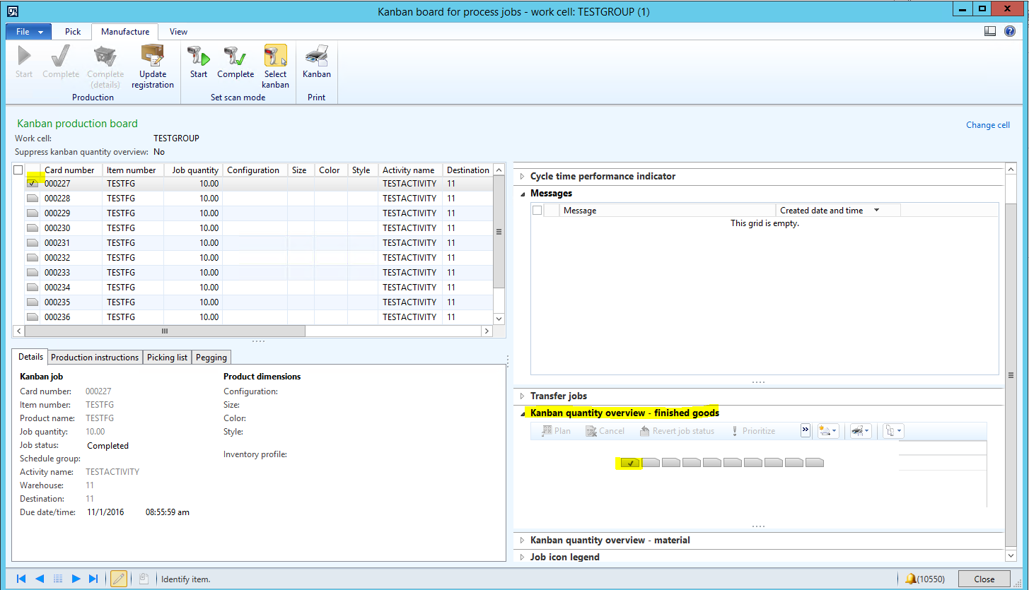 - In the Kanban board for process jobs form, click on the first Kanban card for the TESTFG item, click the Manufacture tab from the Action pane at the top, and then click Production | Complete.
