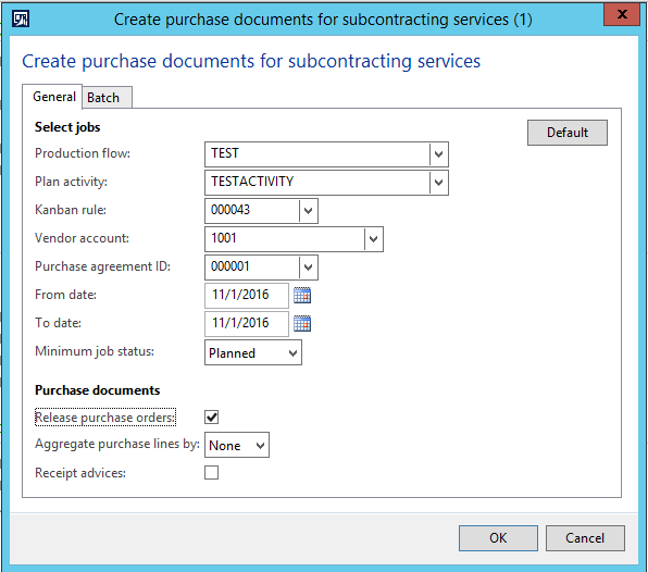 - In the Create purchase documents for subcontracting services form, enter the following, and then click OK: