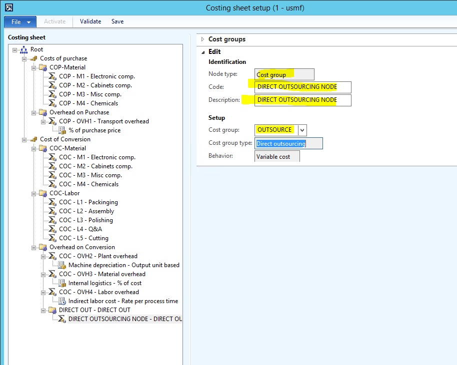 - A Cost Group exists called OUTSOURCE which has a Direct outsourcing Cost group type. The OUTSOURCE Cost group type is added to the Inventory costing sheet.
