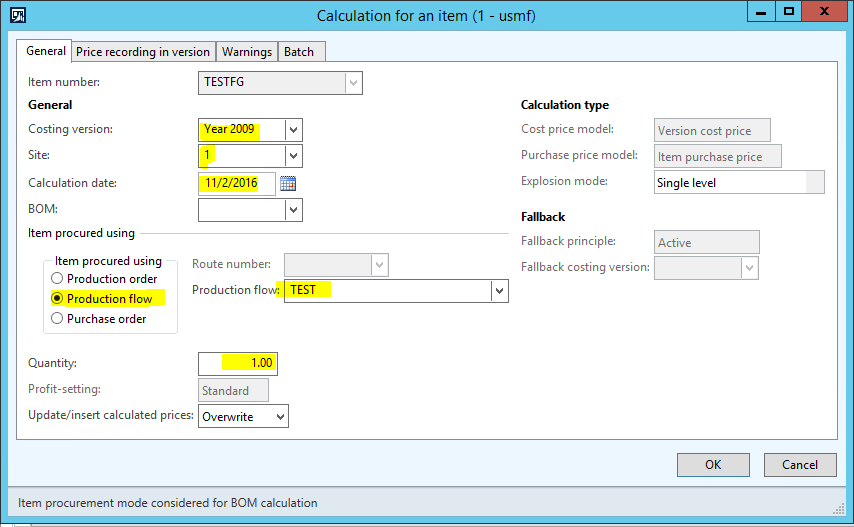 - A FG Item exists called TESTFG which has a Standard Cost Item model group assigned.