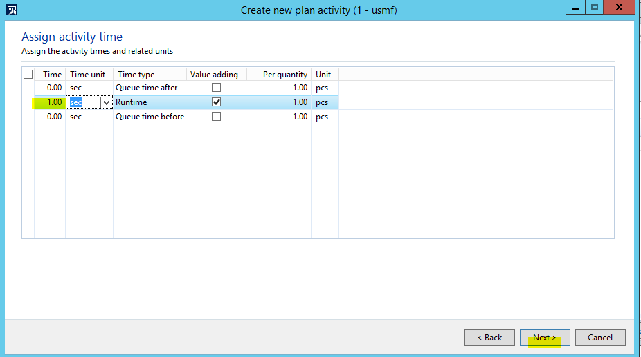 - In the Assign activity time area of the Wizard, enter ‘1.00’ in the Time field for the Runtime line, and then click Next.