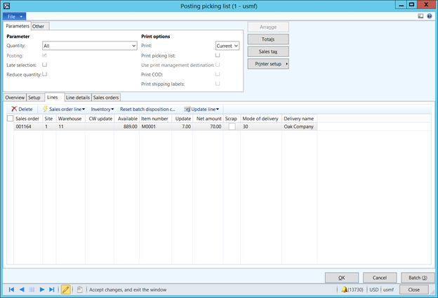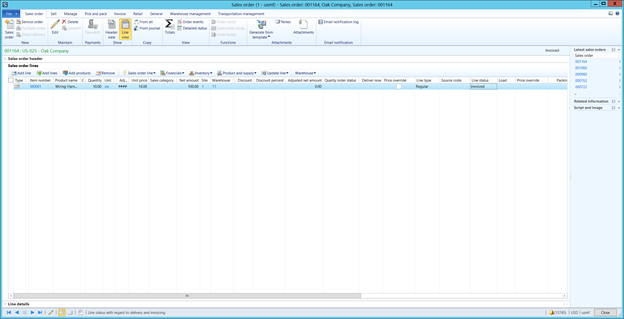 NOTE: Sales order line status is Invoiced as it was invoiced as part of the Item requirement (which is Invoiced after posting the Packing slip)