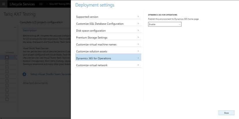 Last week, we released a new feature in Lifecycle Services (LCS) that allows you to take advantage of the full Dynamics 365 experience. In the deployment flow for all new Dynamics 365 for Operations deployments, there is a new option that allows you to specify if you want the new environment to be pinned to the Dynamics 365 home page. Previously, only Dynamics 365 for Operations – Production SKU displayed on the Dynamics 365 home page. With this new option, any type of Dynamics 365 for Operations environment can be shown on the Dynamics 365 home page.