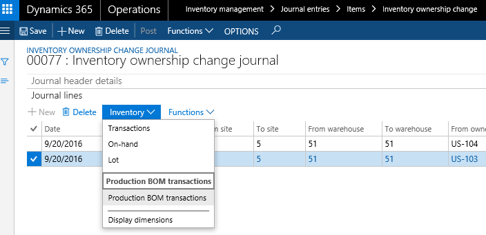 - Process an ownership change journal that is linked to a production, to record the change of ownership of the inventory from the vendor to the current legal entity.