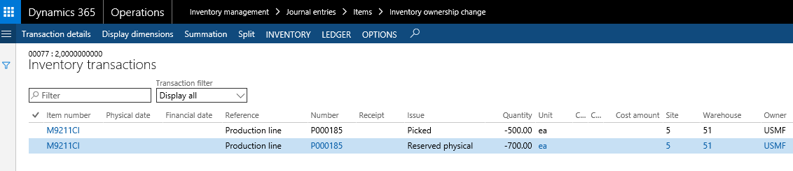 As it can be seen from the above screenshot, the inventory ownership change process automatically updated the Issue field with Reserved physically and Picked and the Owner dimension value is updated to USMF.