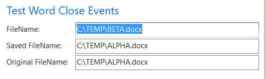 - Back to the remaining document, BETA.DOCX, do some modifications to the document (this is not mandatory) and then save the document with a different name (save as) like. E.g. C:\TEMP\GAMMA.docx and close it. The Test Word Close Events page will trigger the close event and report the following