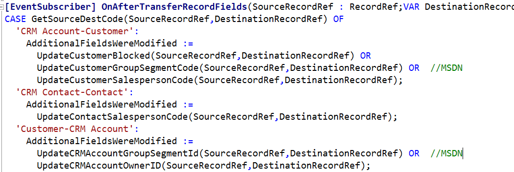 - For a typical manual synchronization within a card page, change Codeunit 5330 “CRM Integration Management”