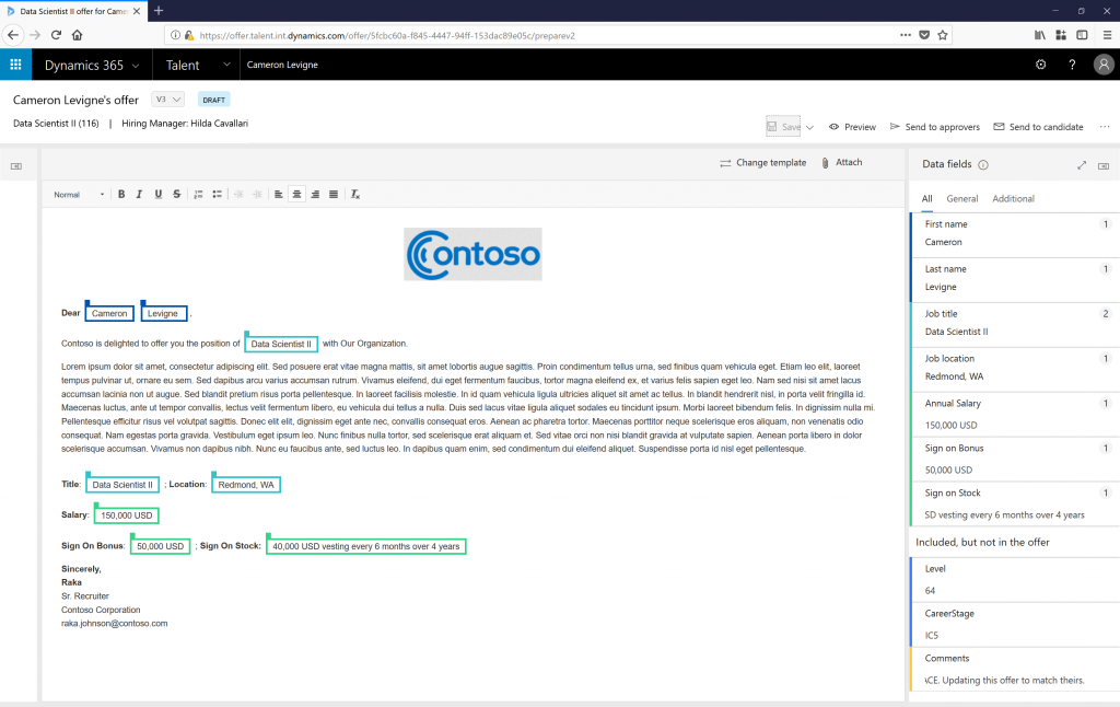 Integrated Offer management – The end to end hiring process needs to flexible and collaborative, and that doesn’t stop once the top candidate has been selected. Those principles carry over into the offer process as well. With an integrated offer management solution, formal offers can be prepared via templates or from a blank slate depending on the uniqueness of the offer. The hiring team can ensure that the candidate receives the correct offer by using collaborative approvals that provide visibility among the hiring team and key stakeholders. Lastly, the recruiter can send the prepared offer to the candidate for their signature. Candidates can sign their offer digitally or decline the offer, keeping the recruiter updated real-time.
