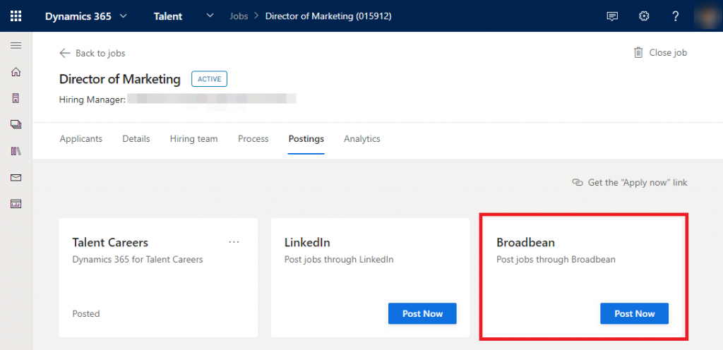Dynamics 365 for Talent Attract customers can now use Broadbean as a part of their sourcing toolkit, to directly multi-post job advertisements to a wide variety of sources. Once the integration is setup by the Attract administrator, the hiring team can post any active job directly through Broadbean from Attract with a couple of clicks. With Broadbean, customers can also track every single application and manage sourcing strategy return on investment.