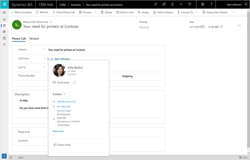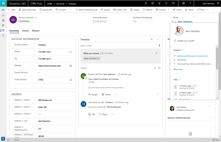 Profile cards exist in Outlook and other Office apps today to help you collaborate with a person, whether they are your colleague or an external contact. They enable you to have their information at your fingertips wherever you are in the Office ecosystem. Starting today, this experience is rolling out for Dynamics 365 so you can take the same actions on your data in Common Data Service within Unified Interface.