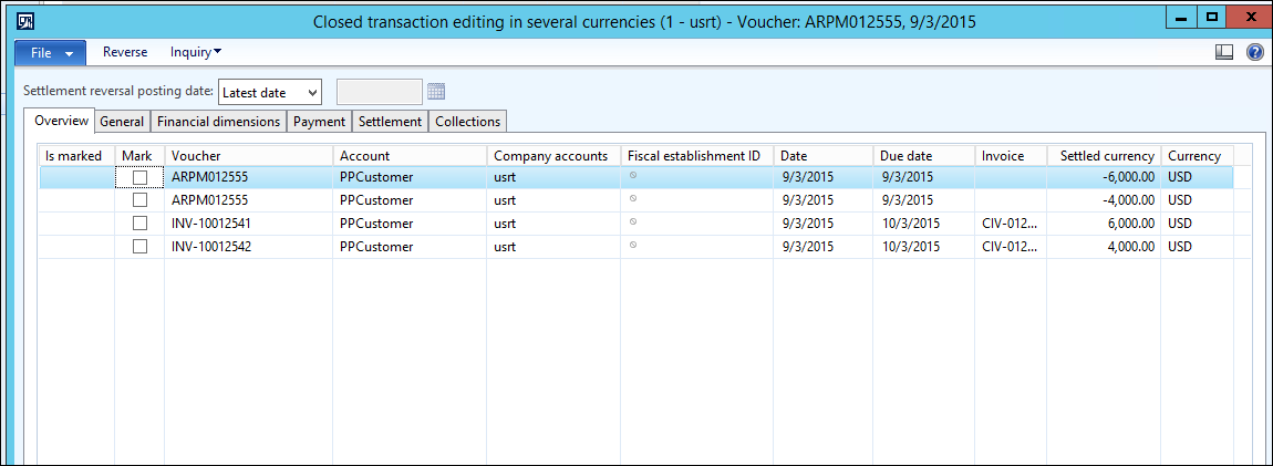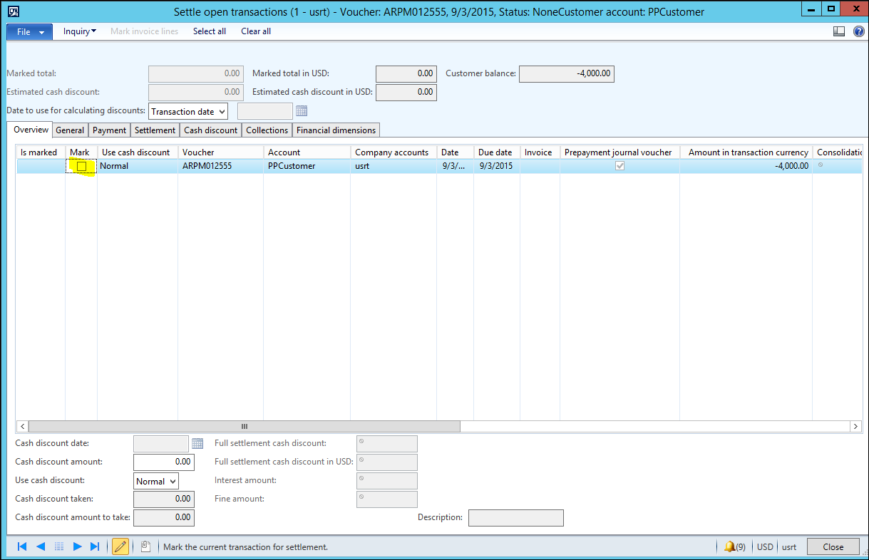 If you go to the Customer > Collect tab > Settle > Closed transaction editing, you can see that the entire prepayment has been settled.