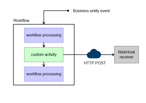 The business entity that triggered the event is available both to the workflow and to custom code that is run from the workflow. As we will see below, both workflows and custom workflow activities can perform additional processing before sending a WebHook, which enables scenarios like filtering when a WebHook should be sent based on privilege or the value of a field.