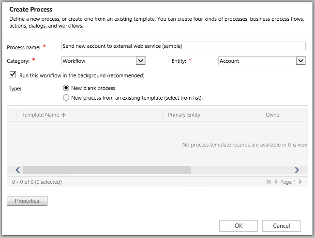 To set up CRM to use the custom workflow activity to send a WebHook, we’ll leverage the event pipeline and workflow triggers. We’ll define a workflow that triggers for our basic scenario (in this example, when creating an account). In the CRM application, choose Settings > Processes > New to create a new workflow process.