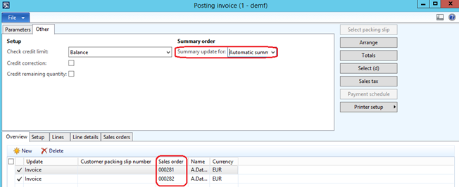 Go to Periodic| sales update| Invoice. Then retrieve customer sales orders, the system will retrieve the two sales orders in the lines. The summary update must be Automatic summary option.