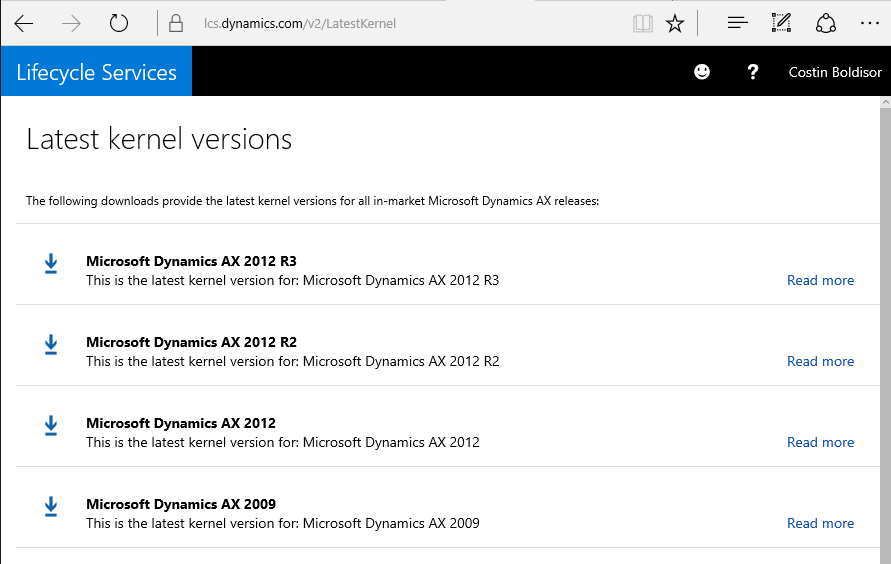 The new feature from LCS, Latest Kernels, allows you to quickly find the latest binaries for all in-market AX 2009 and 2012 versions. They are updated on a monthly basis, although only Microsoft Dynamics AX 2012 R2 and R3 are likely to change every month.