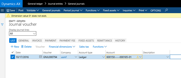 An area we have seen customers encounter issues in is within a General Journal. For example, in a general journal when entering dimensions in the account field, you may select a Main Account followed by a Subproject. If the chart of accounts delimiter and the subproject both contain dashes you may experience an error in the journal when selecting this subproject dimension value of “Dimension value xxx does not exist”. Screenshots of this example are below for your reference.