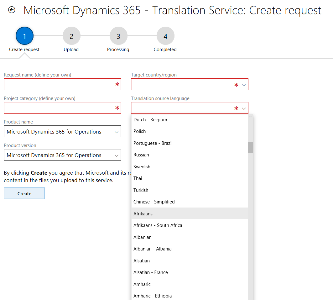 The list of the support languages in the service have been extended, however they are sorted into two different groups. You will find the first group contains the product general availability (GA) languages, and the second group contains the extended partner languages. The second group starts with Afrikaans in the following screenshot. This grouping affects the sorting, so continue to scroll if you want to select a non-GA language for the service.
