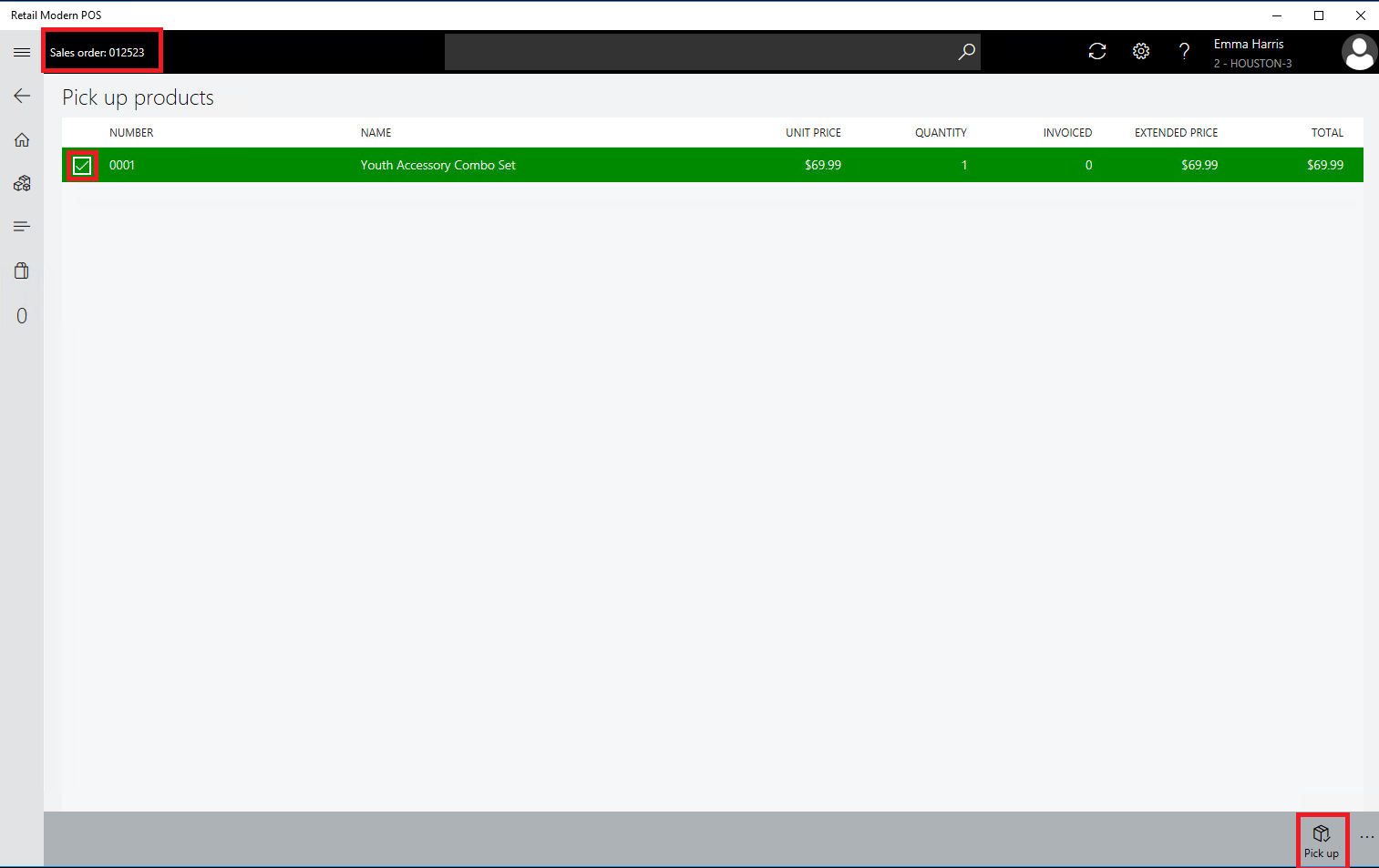 17.) In the Pick up products form, you should see the correct item to pick up and the Sales order number. Click Pick up
