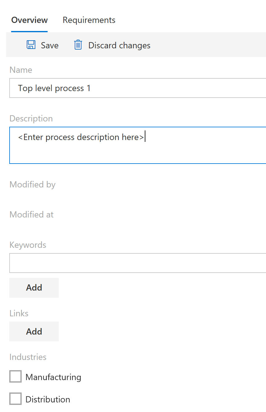 - Select the industries and countries/regions that this process applies to. You can also add keywords and links. Keywords can be used to define categories, work streams, or other metadata. Links (URLs) allow you to reference external sites or documentation.
