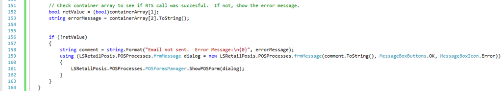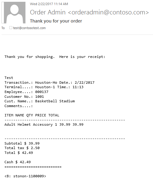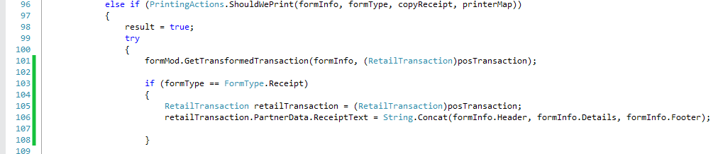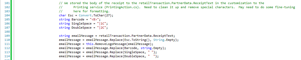 Keep in mind that receipt printing is pretty simple: using a form layout as defined in the Receipt Format Designer, data from the Retail Transaction object is converted to a simple string of formatted text. This is then sent as-is (with some simple formatting) to the printer. For our customization, we will intercept that string and save it to a PartnerData variable on the transaction (see this blog post for information about PartnerData). This value will then persist to our trigger and we can use it as the body of the email.