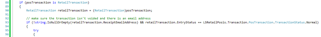 As a refresher, I talk about customizing Realtime Service (previously Transaction Service) in this blog post. In this case, the X++ work is already done for us since we’ll be using the same method that MPOS calls: SendEmail. A good place to add this call is in the PostEndTransaction trigger (in the TransactionTriggers project).
