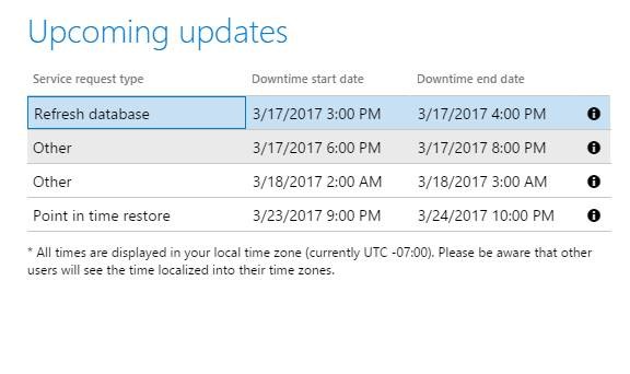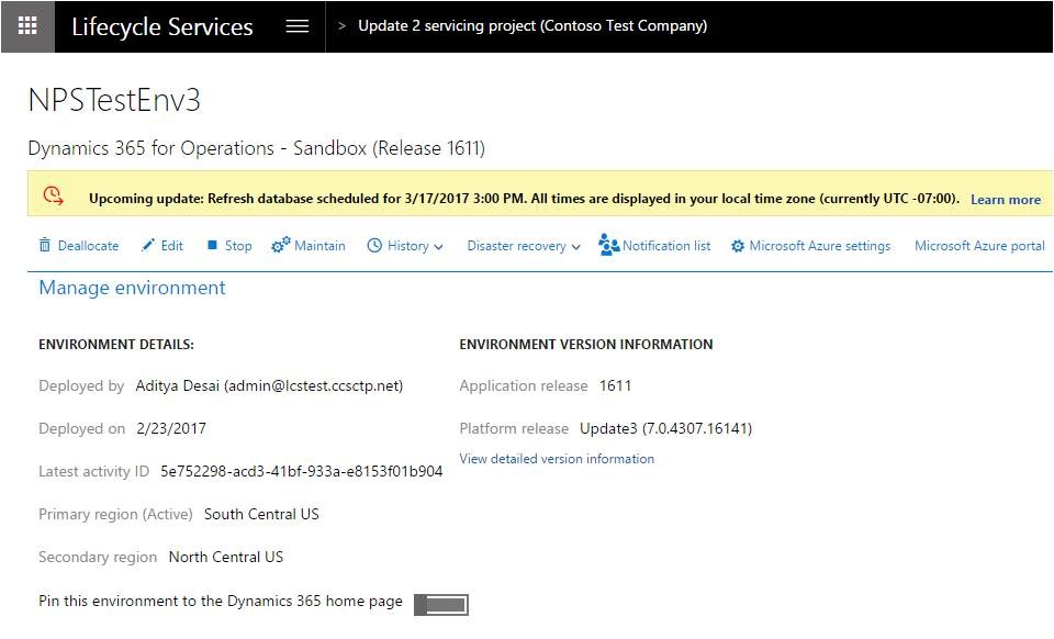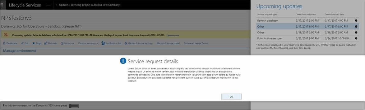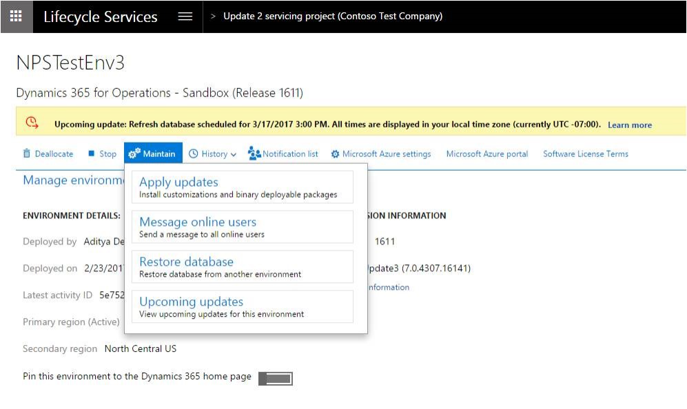 In the March release of LCS, you can view upcoming updates for your environment. You can view the scheduled updates by clicking Maintain > Upcoming updates . Any maintenance to the environment that you initiate (package deployment on a specific day, sandbox refresh, point-in time restore, etc.), will be shown in the update list.