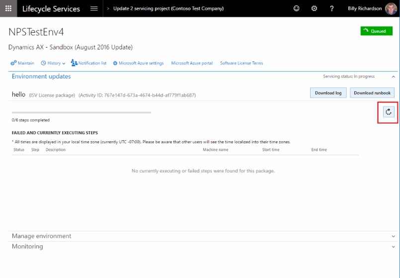 In the March release of LCS, we have added a Refresh button so that you can more easily view the status on a servicing operation.