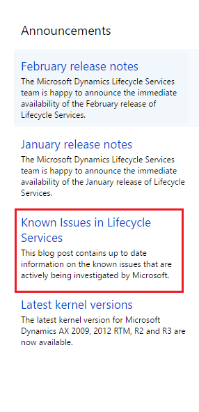 We now have a permanent page in the LCS Blog that will be kept up to date with the known issues in Lifecycle Services that Microsoft is tracking and is currently investigating. This can be accessed from the  Announcements section on the LCS dashboard.