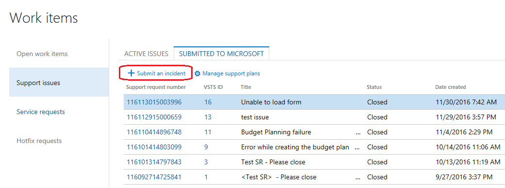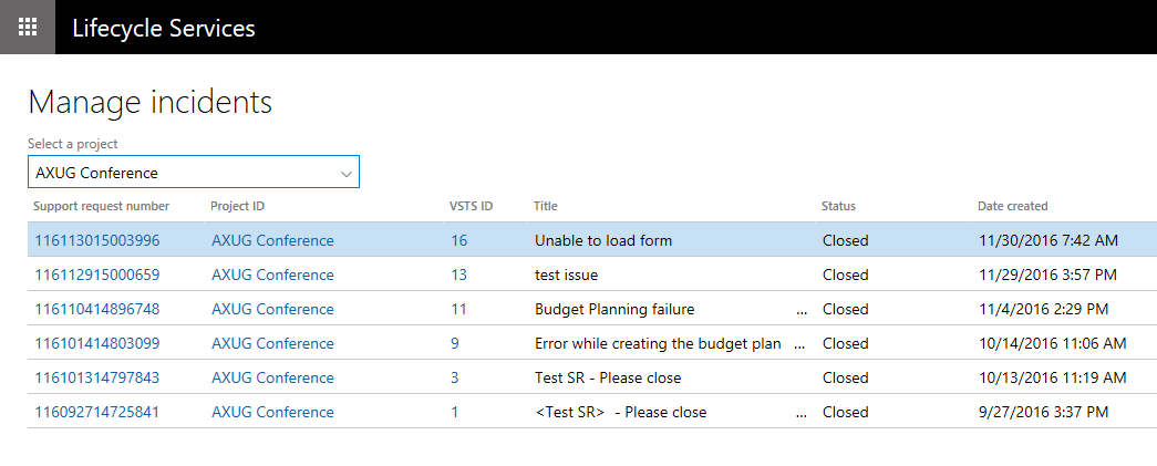 The Manage incidents page has been updated to match the Submitted to Microsoft incidents page which you can access by clicking the Support tile in a project. Click the Project ID link to open the Project incident page.