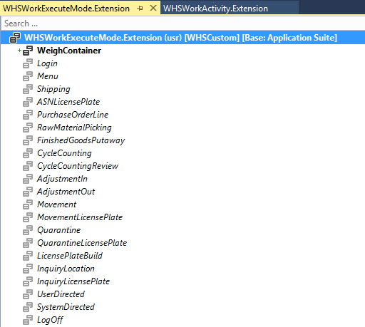 Just as in the previous blog post – to add a new “indirect work mode” workflow we will need to add values to the two enumerations WHSWorkExecuteMode and WHSWorkActvity. The new enum names need to match exactly as one will be used to instantiate the other deep inside the framework. Note that both should be added as enumeration extensions built in a custom model. Once this has been done it will be possible to create the menu item in the UI – since the WHSWorkActvity enumeration controls the list of available workflows in the UI: