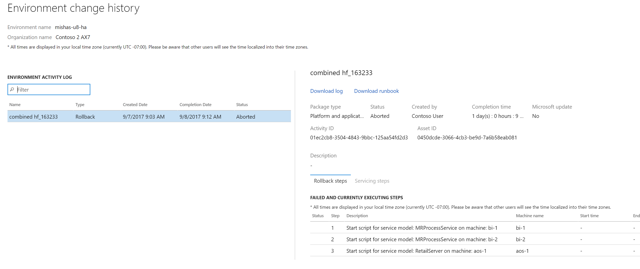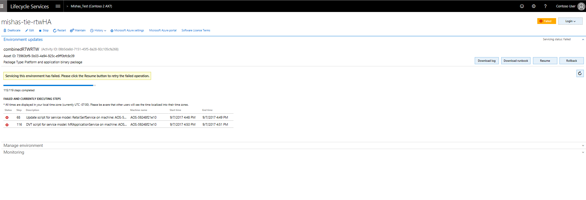 With the September release of LCS, we have added support, including the new buttons Resume and Roll back, to roll back packages when package application fails. When a package application fails, we recommend that you first click Resume, to verify if the failure is due to instability if the step passes on re-run. If the failure continues, click Roll back to restore the environment to a good state.
