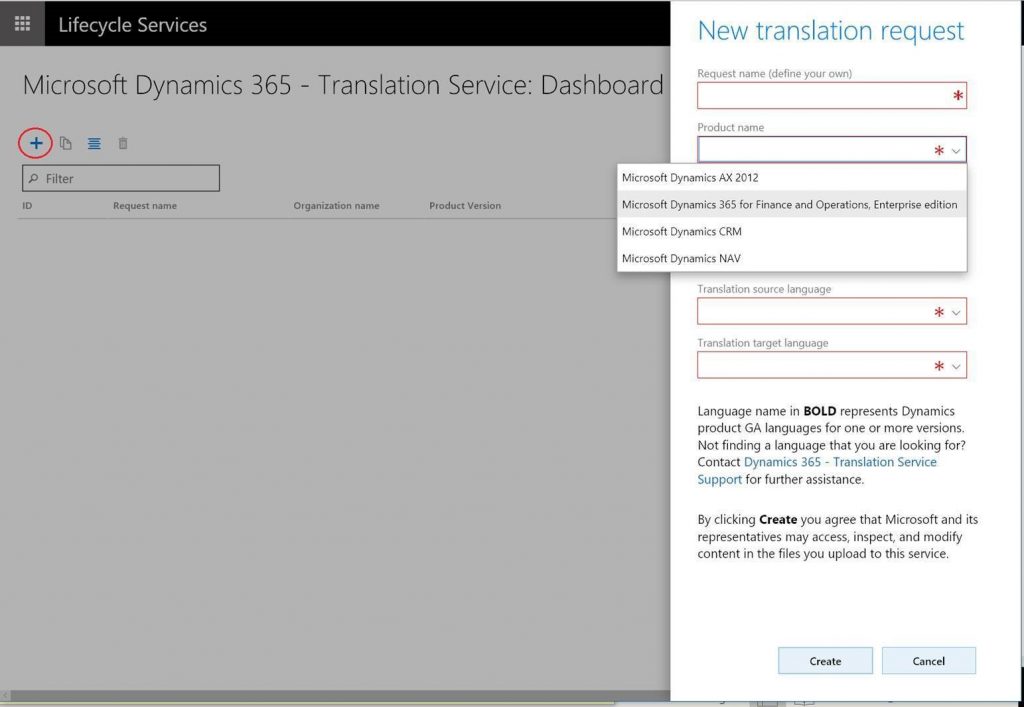 From this dashboard, click the + icon to create a new translation service request for any product that the service supports.
