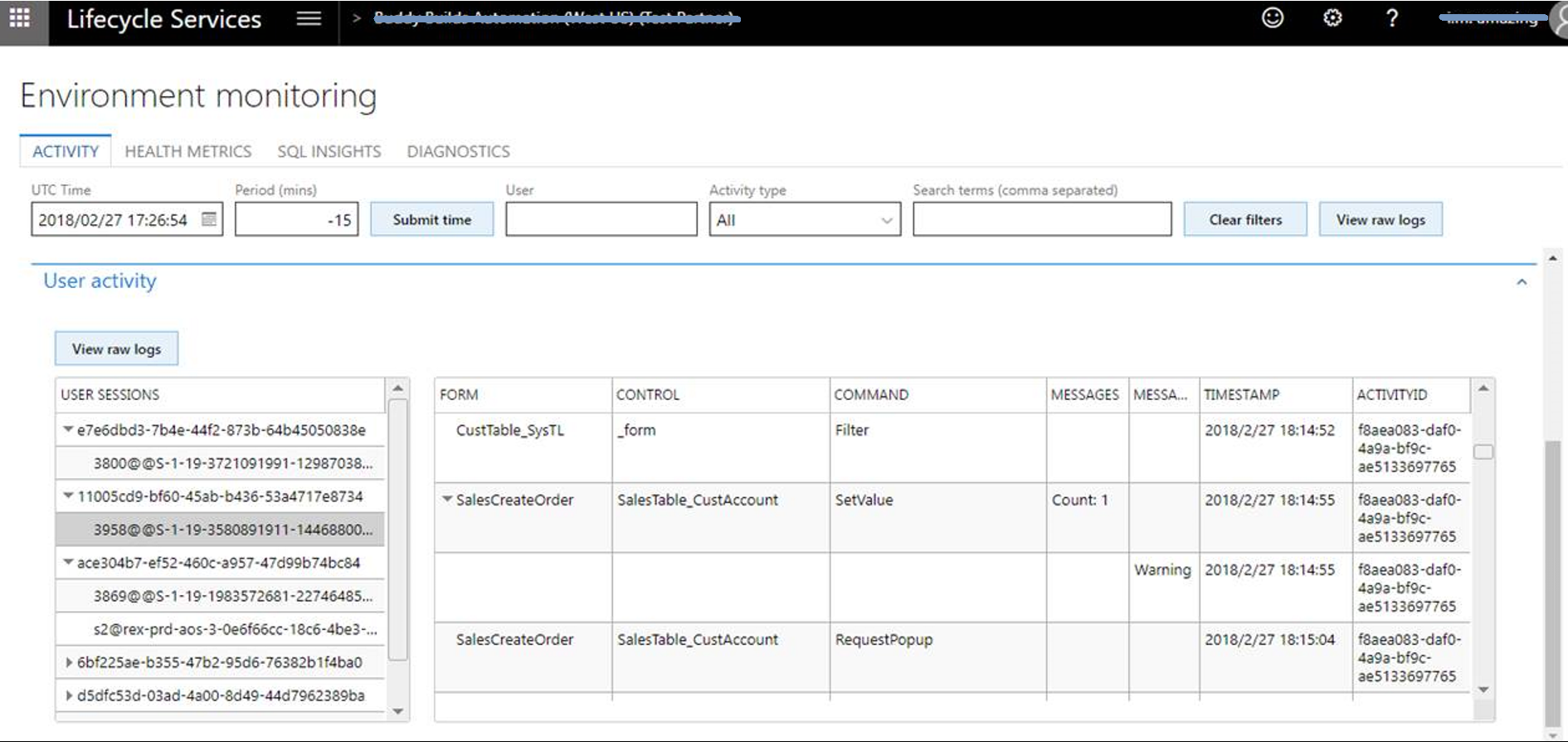 In this release of LCS, we have updated the User activity section on the Environment monitoring page to improve the user experience as well as the performance of loading this page. The user will now need to select a user session in the User sessions grid to see a detailed list of interactions on the grid on the left. The following screenshot shows the new user interface.
