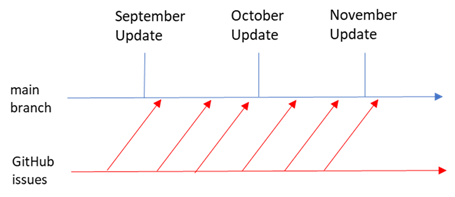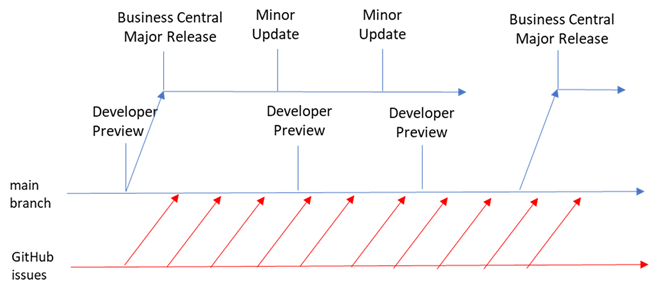 As you can notice, Business Central includes all features and fixes that went into each Developer Preview release prior to branching. As you can also see from the diagram, GitHub continues to be the support and feedback forum only for the latest Developer Preview releases from the main branch.