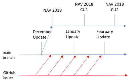 As you can see the Developer Previews continued to be released from the main branch. This was also the branch in which we continued fixing all issues reported through GitHub. However, since Dynamics NAV 2018 became a different codebase, these fixes were not automatically included in the Dynamics NAV 2018 CU releases.