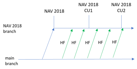 With Dynamics NAV 2018 shipped in December 2017 we branched the codebase (as we always did for every release before) and went into the situation illustrated below: