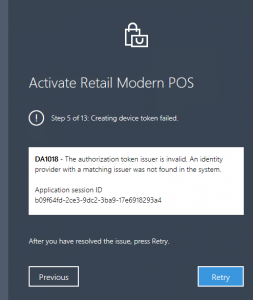 Error “The authorization token issuer is invalid. An identity provider with a matching issuer was not found in the system” upon MPOS activation