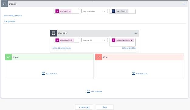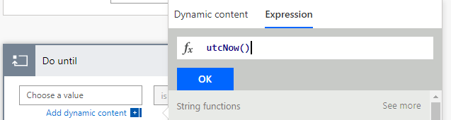 To create a loop, add the Do until action. On the left-hand side of the Do until action, add dynamic content, switch to the expression tab, and add to get the current time.