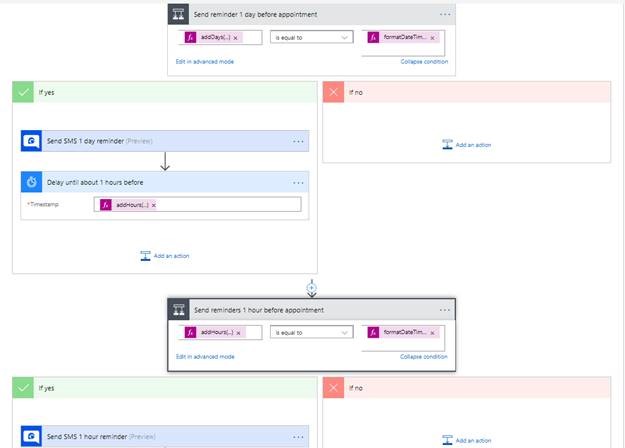 The current time and start time are both stored in the UTC time zone with day, month, year, hour (on a 24-hour clock), second, and millisecond. As stated in the previous step, it is not guaranteed that the check to see if the current time is equal to time you want to send a reminder will execute at the exact time required, down to the millisecond. The looping action is one way to ensure the check happens at the precise time intended. You should also truncate the current and reminder times to get rid of the milliseconds. This furthers the reliability and ensures that when the check happens, the values are the same and the Flow will send an appointment reminder.