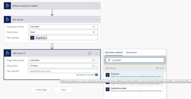 Now that you have the case information, you’ll be able to get the customer information associated with that case. Add a new step and get another record as you did before.