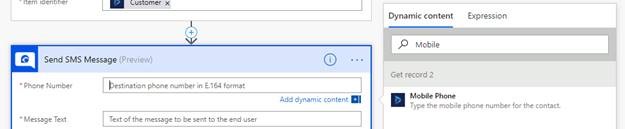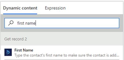 To get the customers first name, add dynamic content and add the First Name associated with the customer record grabbed previously.