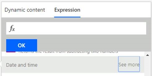 On the left-hand side of the Condition action, use the expression addDays, which has three inputs: timestamp, number of days to add, and format. The timestamp will be the current time (utcNow()). The number of days to add will be 1, and the format will be the one I selected and show above. It will look like this.