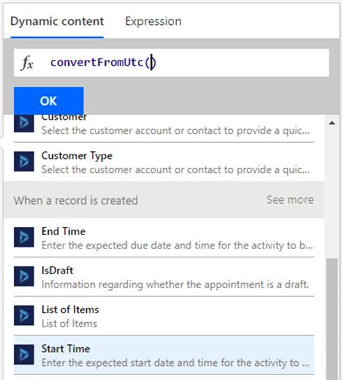 You should find an option titled ConvertFromUTC(). ConvertFromUTC() takes three inputs in the following order: timestamp, target time zone, and format (which is optional), all of which need to be separated by a comma. To get the timestamp, navigate back to dynamic content and scroll until you find Start Time associated with the appointment.