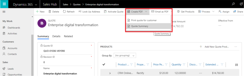 When a customer is ready for a formal proposal that contains the most current pricing information and product quantities, they are generally presented with a quote. Until now, a salesperson using Dynamics 365 for Sales could generate quote documents only in Word format using Microsoft Office templates. They then had to convert the Word docs to PDF manually and then share them with customers. With PDF generation from quotes generally available, salespeople can now quickly create PDF quote documents based on standard templates to share with customers.