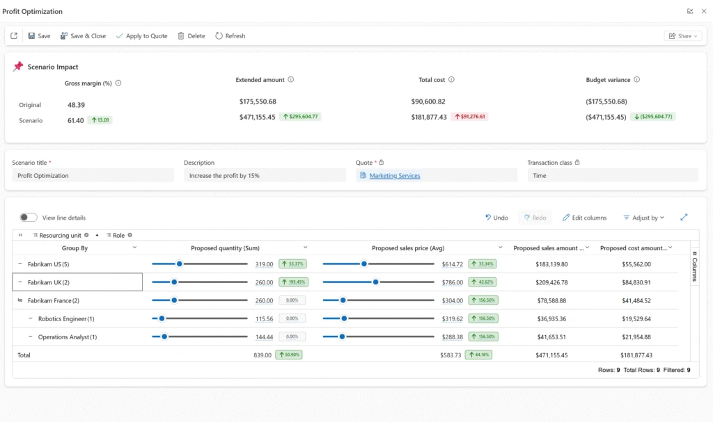 Within the simulation workspace, you can adjust quantities and pricing across dimensions such as resourcing unit, role, or any custom pricing dimension configured in your environment. Whether you’re making high-level adjustments or refining details at the quote line level, the experience is designed to be flexible and intuitive.