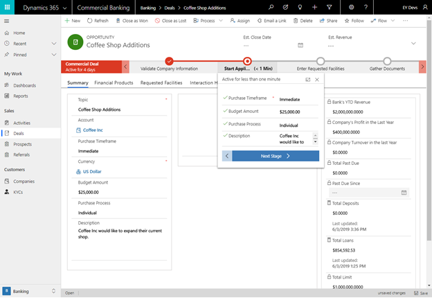 In planning to qualify a new lead or renewal on a Loan, the Relationship Manager starts by reviewing all the activities that have taken place within an account (company), reviews the clients holdings both internal and external and does a needs analysis to better understand the accounts position and what loan would work best with the least amount of risk to the bank. After his assessment he initiates a new Loan opportunity using his quick create menu. The goal here was to create a “Single Source of Truth” for the RM where he can review client financials, transactions, next best actions, offers, alerts, account hierarchy and also review org charts which are out of the box Dynamics 365 features to provide a holistic 360 view of a customer’s account.