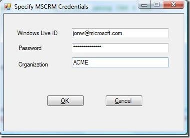 Enter in your Windows Live ID that you have used for your CRM authorization. Enter your password and organization name.