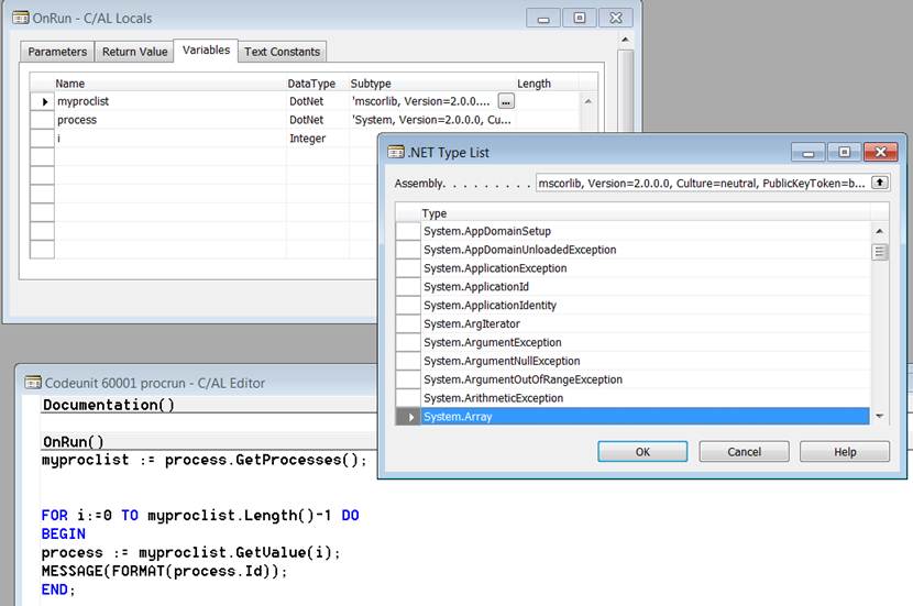 Rather than elaborate more on the properties and definitions, let’s look at a sample. In this code sample, we will use methods from the .NET Framework to retrieve a list of processes running on the NAV Server and show the process IDs in a message box. The sample is not exactly an ERP task but shows what can now be achieved by using .NET and hopes to show that familiar code patterns can be applied.